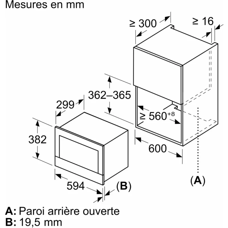 - Hauteur niche d’encastrement : Micro ondes hauteur 38 cm