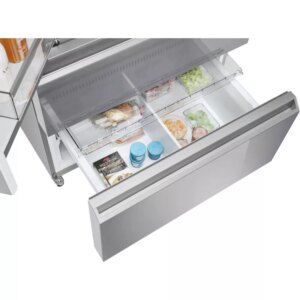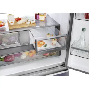 Classé en catégorie énergétique E, le HFR79F19EFGK est conçu pour réduire la consommation d’énergie de 20% par rapport aux modèles de classe F, tout en offrant des performances de refroidissement supérieures. Le compresseur Inverter diminue les variations de température, prolongeant ainsi la vie de l’appareil et réduisant le niveau sonore à seulement 37 dB. Ce modèle se distingue également par son design French Door 90 avec un revêtement en inox et verre (Iconic Glass), qui apporte une touche d’élégance moderne à toute cuisine.