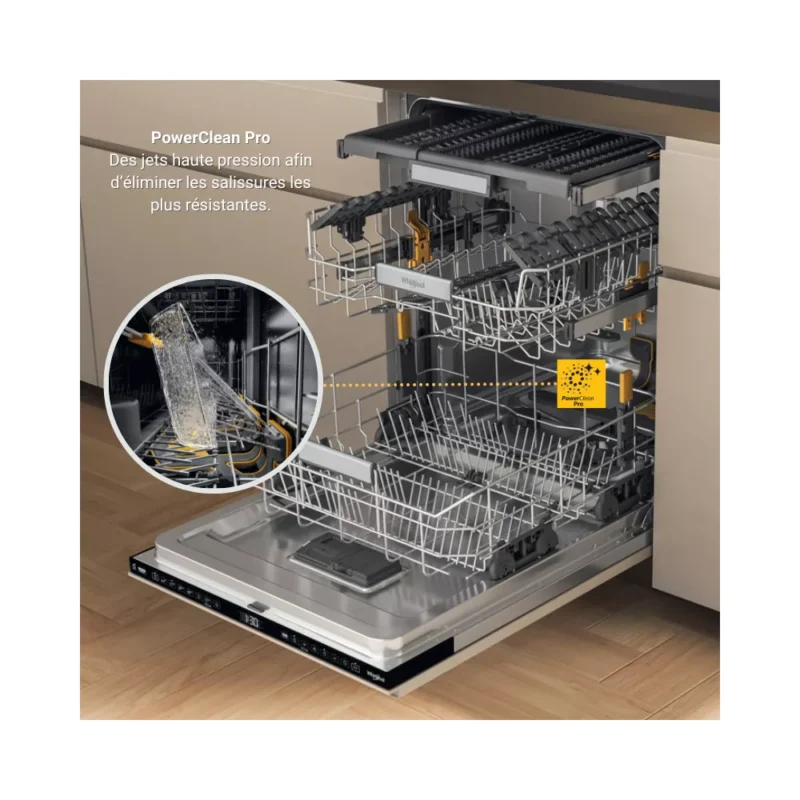 PowerClean Pro Des jets 60% plus puissants* situés dans le panier inférieur pour une vaisselle parfaitement propre, même avec des aliments brûlés, tout en gagnant 30% d’espace supplémentaire**.