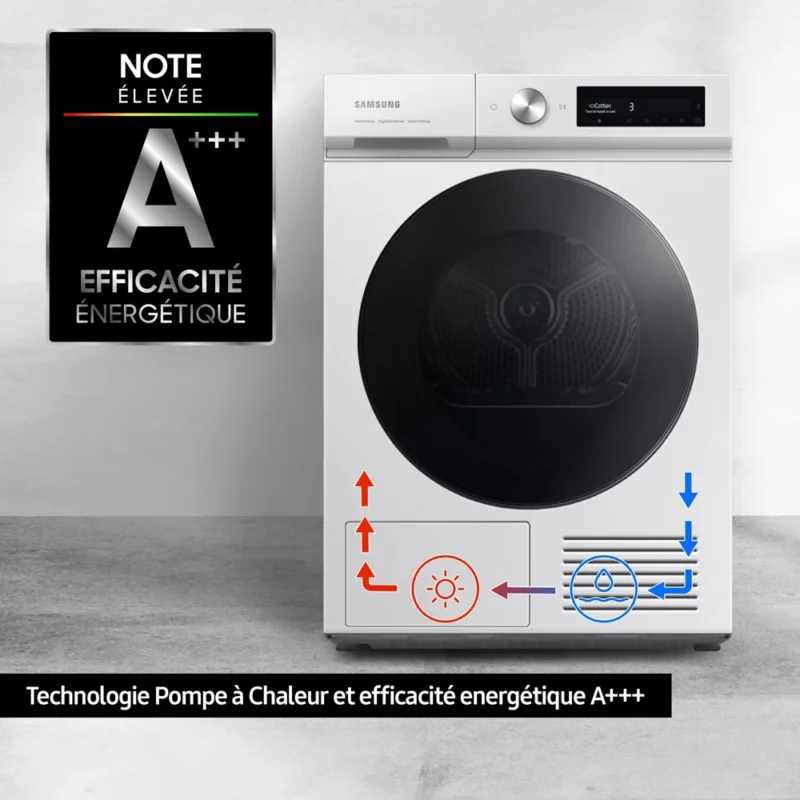 Si vous cherchez un sèche-linge efficace et peu énergivore, le SAMSUNG DV90BB7445GWS3 Bespoke est fait pour vous.