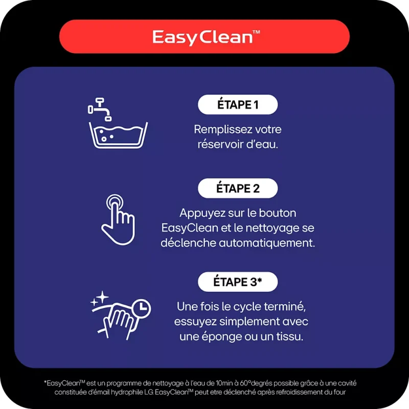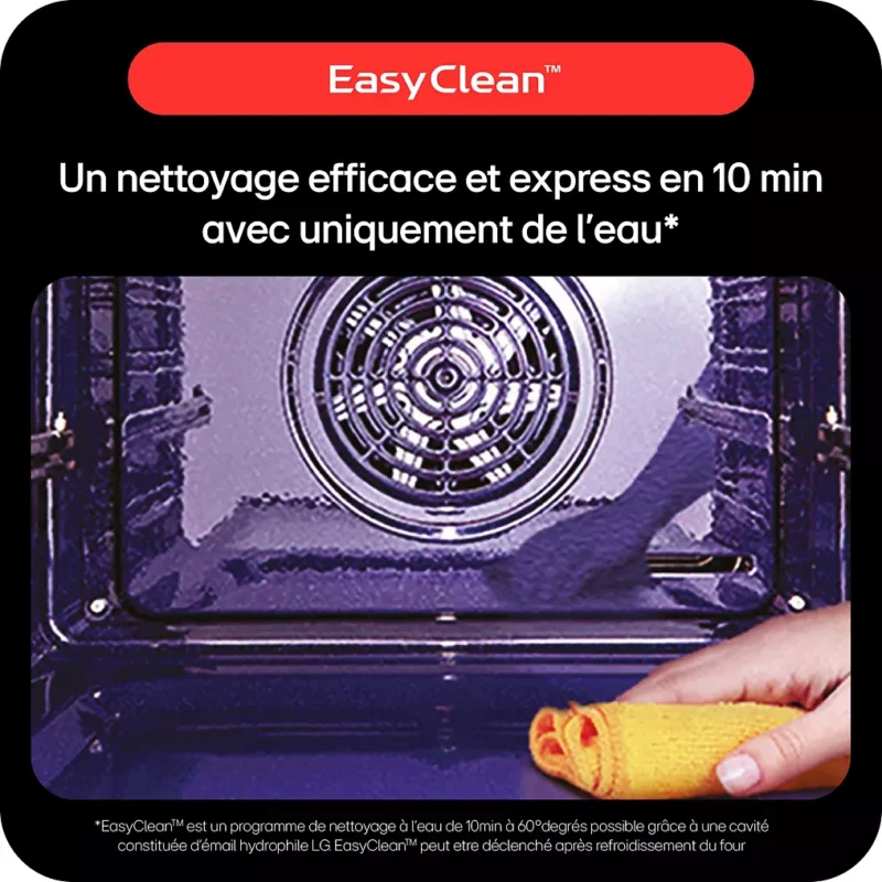 Pour le nettoyage, la technologie EasyClean™ permet de rendre le four impeccable en seulement 10 minutes, grâce à un programme de nettoyage vapeur rapide et moins énergivore que la pyrolyse.