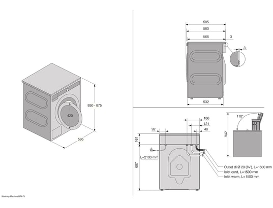 - Conseils : prévoir 2 à 3 cms supplémentaires derrière la machine pour le passage des tuyaux et câbles