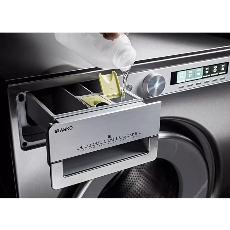 - Distributeur automatique de lessive : oui, remplissez le réservoir 1 fois pour 20 à 35 cycles. La machine adapte la consommation de produits lessiviels en fonction de la quantité de linge et de l’état de saleté.
