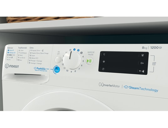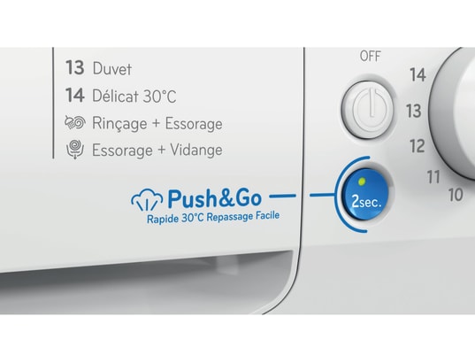 - Le + : avec sa technologie Push&GO Steam, activez un cycle de lavage de moins d’une heure en un seul clic