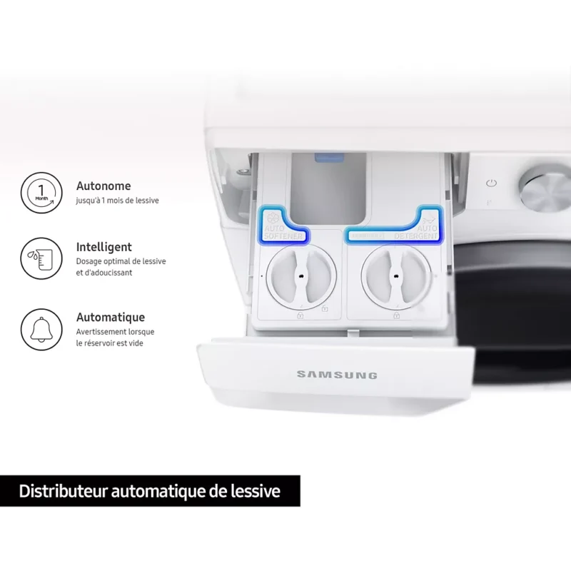 Idéal pour les utilisateurs qui aiment optimiser leur temps, le lave-linge hublot Samsung WW90T684DLH a tout pour vous simplifier la vie. Il dispose notamment d’un distributeur automatique de lessive. Grâce à lui, vous n’aurez qu’à remplir le réservoir et l’appareil s’occupera de libérer la dose optimale après avoir évalué la quantité de linge grâce au capteur de poids.