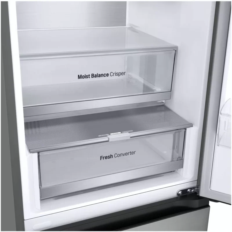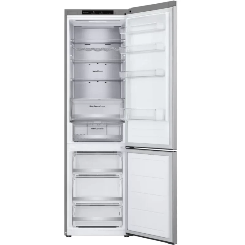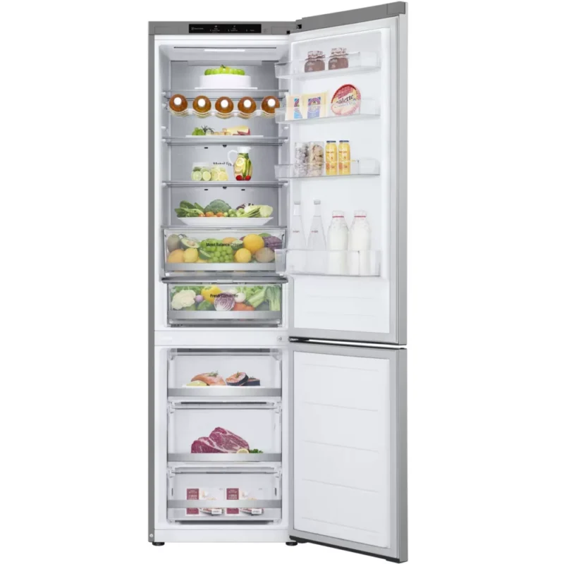 Le réfrigérateur combiné LG GBV5240APY, d’une hauteur de 2,03 mètres et d’une capacité généreuse de 387 litres, est conçu pour répondre aux besoins des familles modernes. Grâce à la technologie Door Cooling™, il assure un refroidissement rapide et uniforme, réduisant les fluctuations de température à seulement 0.5°C, ce qui permet de maintenir les aliments frais plus longtemps. La répartition homogène du froid, de l’avant à l’arrière, garantit une fraîcheur constante pour tous vos produits, y compris ceux rangés dans la porte. Avec ses 277 litres dédiés au réfrigérateur et 110 litres au congélateur, ce modèle est idéal pour stocker une grande quantité d’aliments tout en conservant leur qualité optimale.
