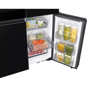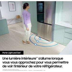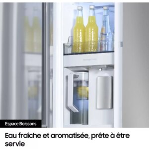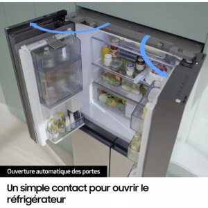 Le design élégant du Samsung RF65DB970E22 est rehaussé par des poignées intégrées qui contribuent à son esthétique moderne. L’Espace Boisson avec Carafe à remplissage automatique est une innovation pratique pour rester hydraté sans effort. De plus, la connectivité Wi-Fi via SmartThings™ permet de contrôler et de programmer la fabrication de glace à distance, directement depuis un smartphone. Avec son éclairage LED, ses clayettes ajustables et son alarme sonore pour porte ouverte, ce réfrigérateur est conçu pour offrir un confort d’utilisation au quotidien, tout en apportant une touche de sophistication à la cuisine.